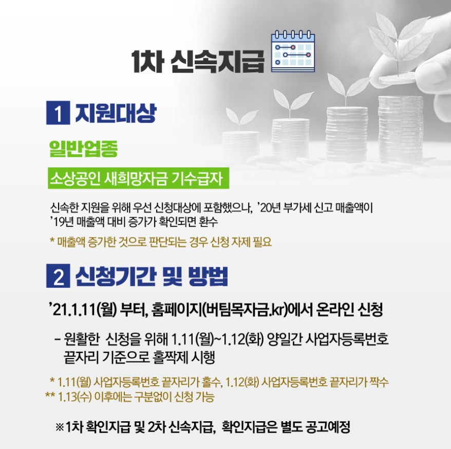 새희망자금(2차 재난지원금)을 받지 못한 일반업종 중 2020년 1~11월에 개업했고 12월 매출액이 9~11월 평균매출액 보다 감소한 6만5000여명도 대상에 포함됐습니다. 새희망자금을 받았으나 버팀목자금 1차 신속지급 대상에는 포함되지 못했던 소상공인 2만4000명도 이번에 지원받을 수 있습니다.