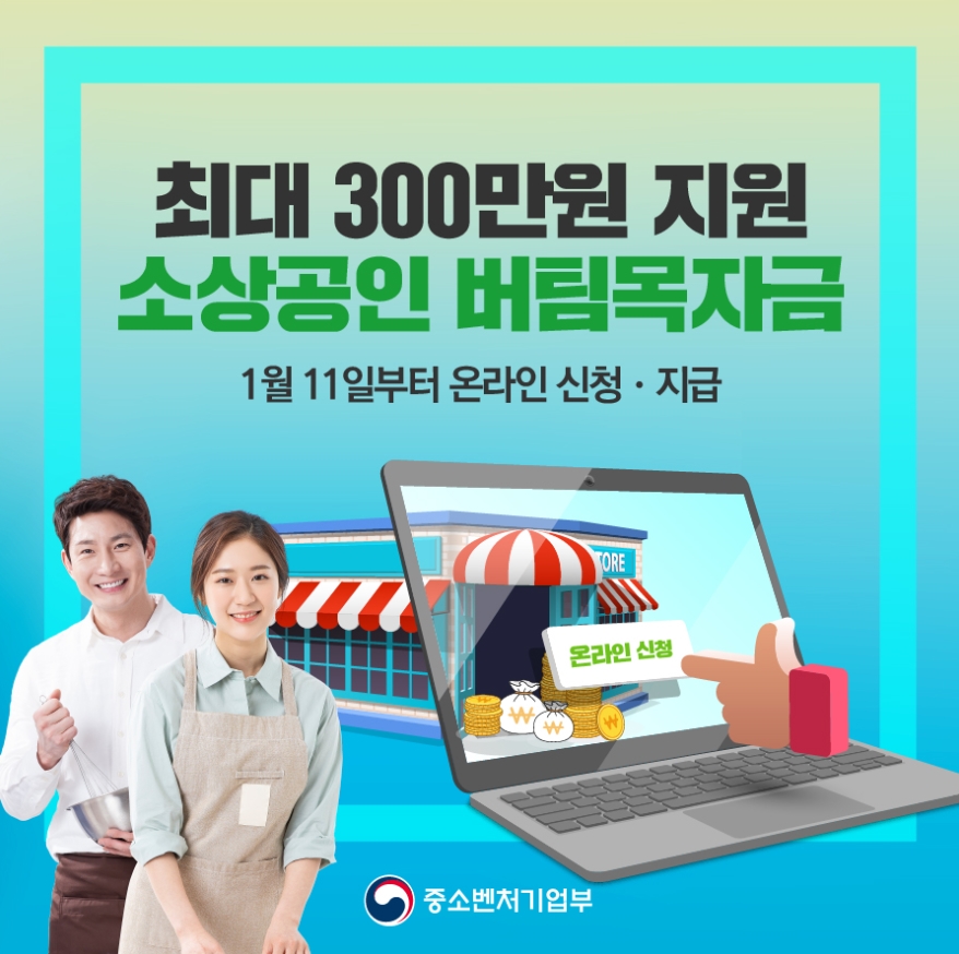 1월 25일 부터 소상공인 15만6000여명에 대한 버팀목자금 2차 신속지급이 시작됩니다. 중소벤처기업부는 소상공인 버팀목자금 신속지급 명단에 15만6000명을 추가해 25일부터 지원대상자에 안내문자메시지를 발송하고 온라인 신청을 받는다고 밝혔습니다.
