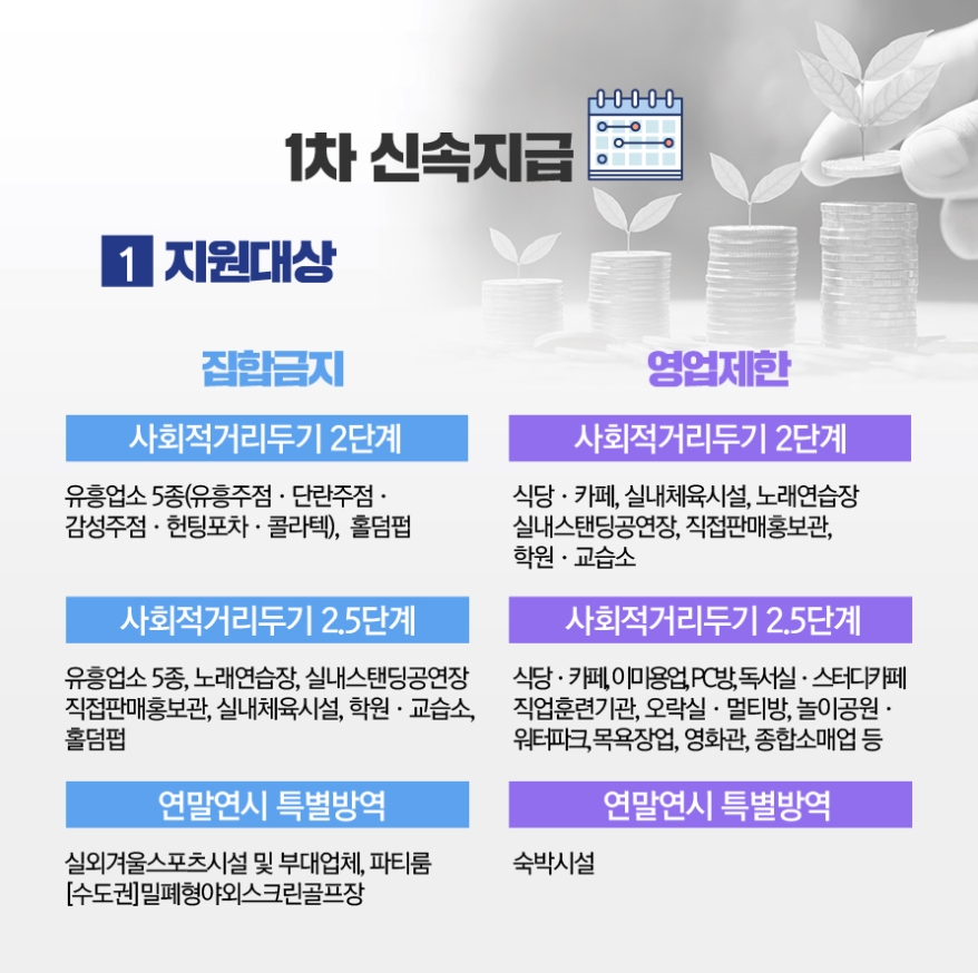 2. (집합금지·영업제한) 중앙재난안전대책본부・지방자치단체의 방역강화로 집합금지 또는 영업제한된 소상공인에 각각 300만원, 200만원