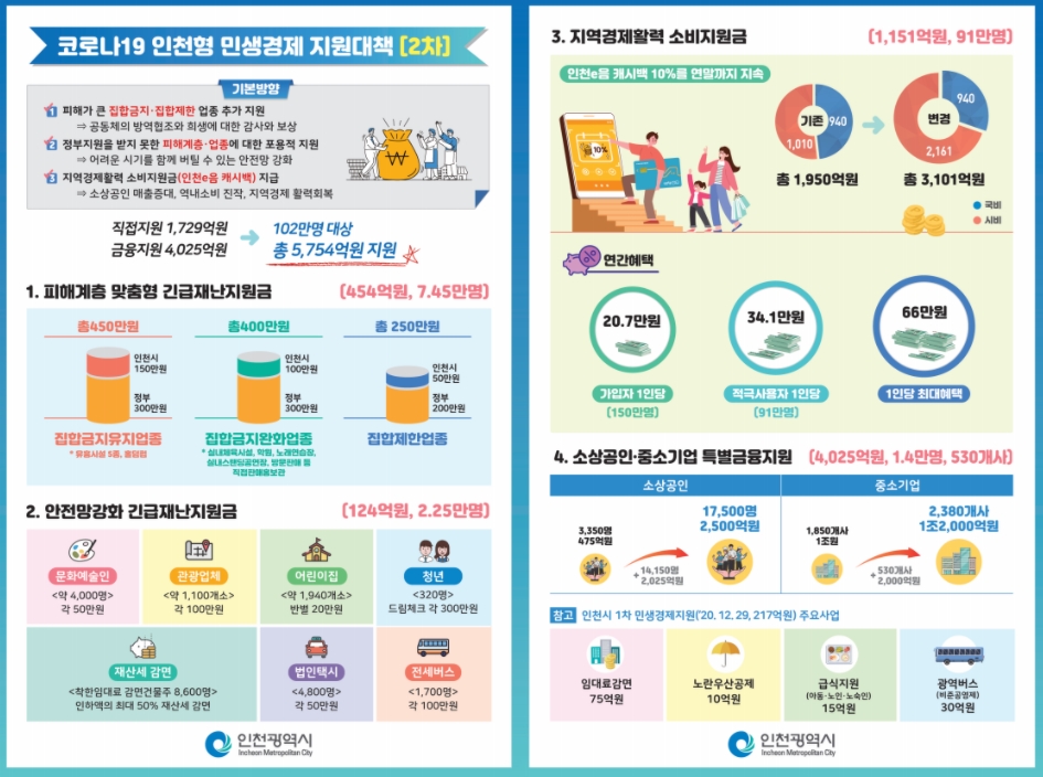 집합금지·제한 업종 등이 매우 큰 어려움을 겪고 있음을 데이터와 현장의 목소리를 통해 확인하였습니다. 지금 상황에서 가장 필요한 곳에, 가장 적절한 방식으로 지원하는 것이 중요한 만큼 시급한 지원이 필요한 시민·소상공인·자영업자·취약계층 등에 ‘인천형 핀셋 지원’을 실시하도록 결정했습니다.